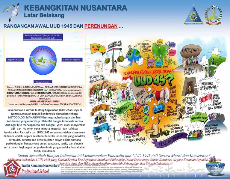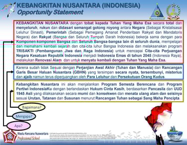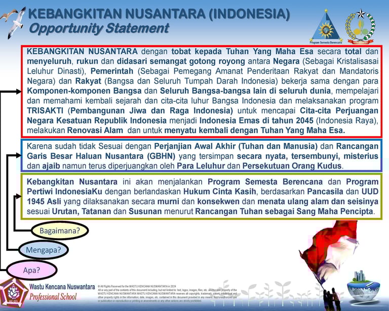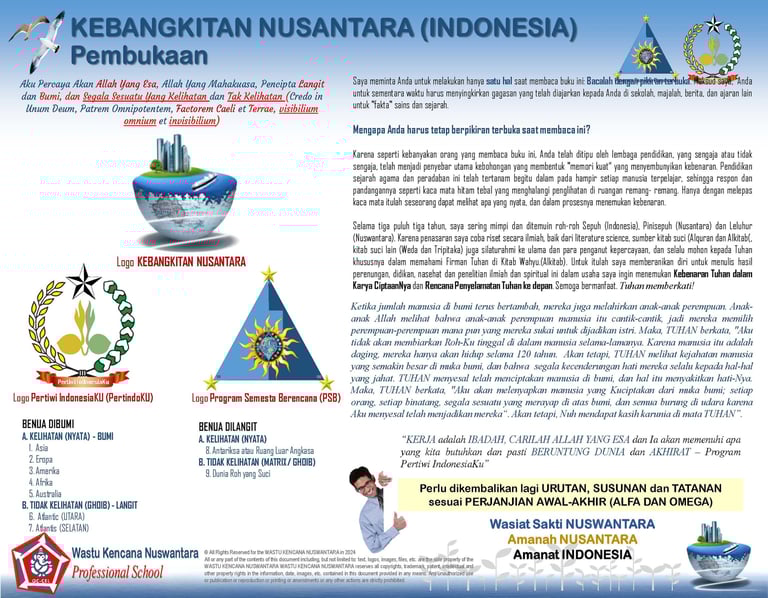 Atas Berkat Tuhan Yang Maha Esa dan Perjuangan Terus Menerus Para Leluhur Bangsa Indonesia, Ditekadkan dengan 1 (Satu) Komando Sistem Gotong Royong (Program Semesta Berencana dan Program Pertiwi Indonesiaku), Dengan Ini Kita Buka Pintu Gerbang Kemerdekaan 17 Agustus 1945 untuk Mewujudkan Cita-cita Proklamasi Kemerdekaan Negara Kesatuan Republik Indonesia Berdasarkan Pancasila Dan UUD 1945 Asli yang Dijalankan Secara Murni dan Konsekwen.